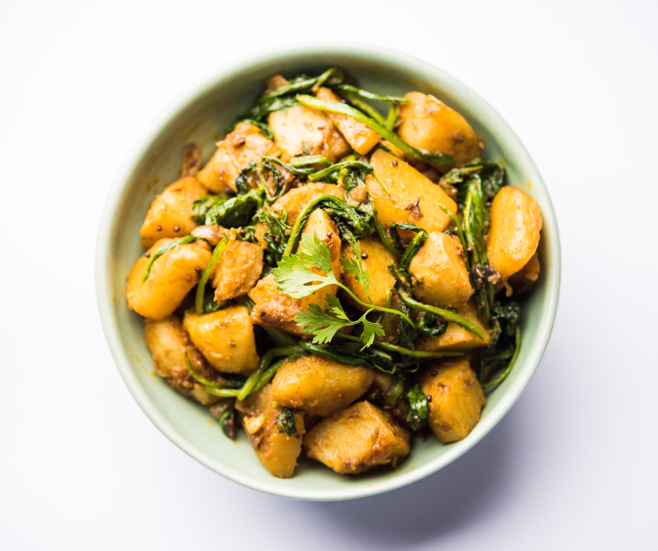 Potatoes cooked with fresh fenugreek leaves and spices, offering a combination of earthy flavors and delightful textures.