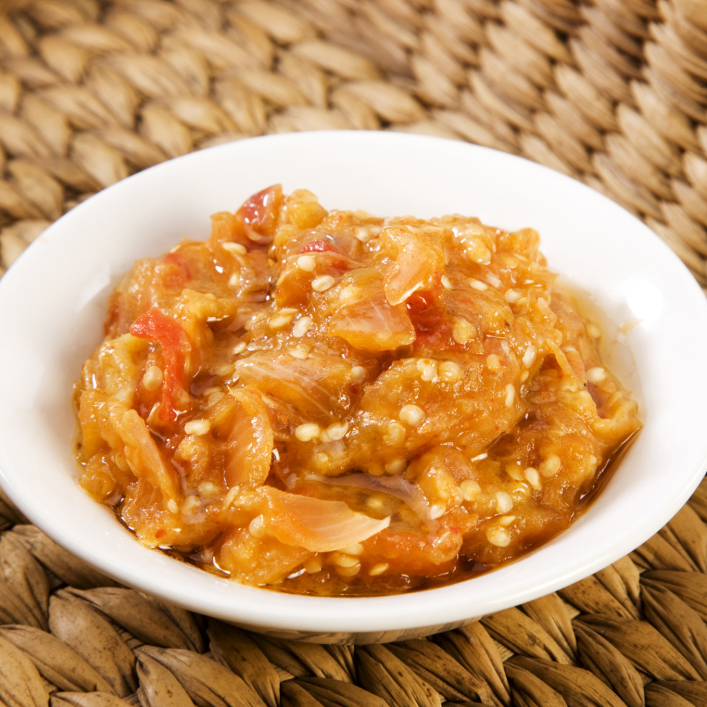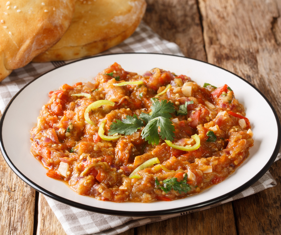 Roasted and mashed eggplant cooked with onions, tomatoes, and spices, resulting in a smoky and flavorful vegetarian dish.