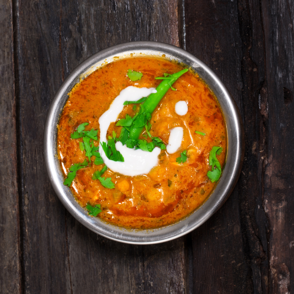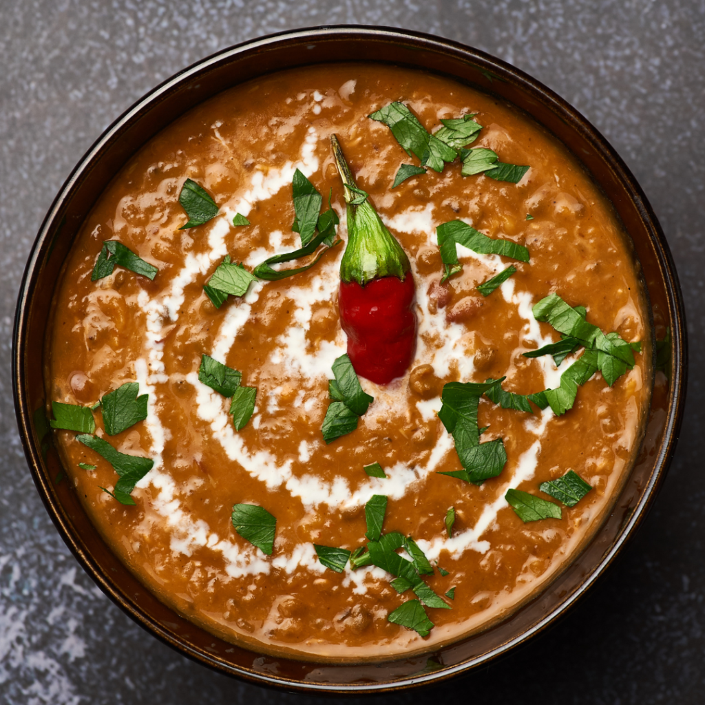 A rich and creamy lentil dish made with whole black lentils, red kidney beans, butter, and spices, often served with naan or rice.
