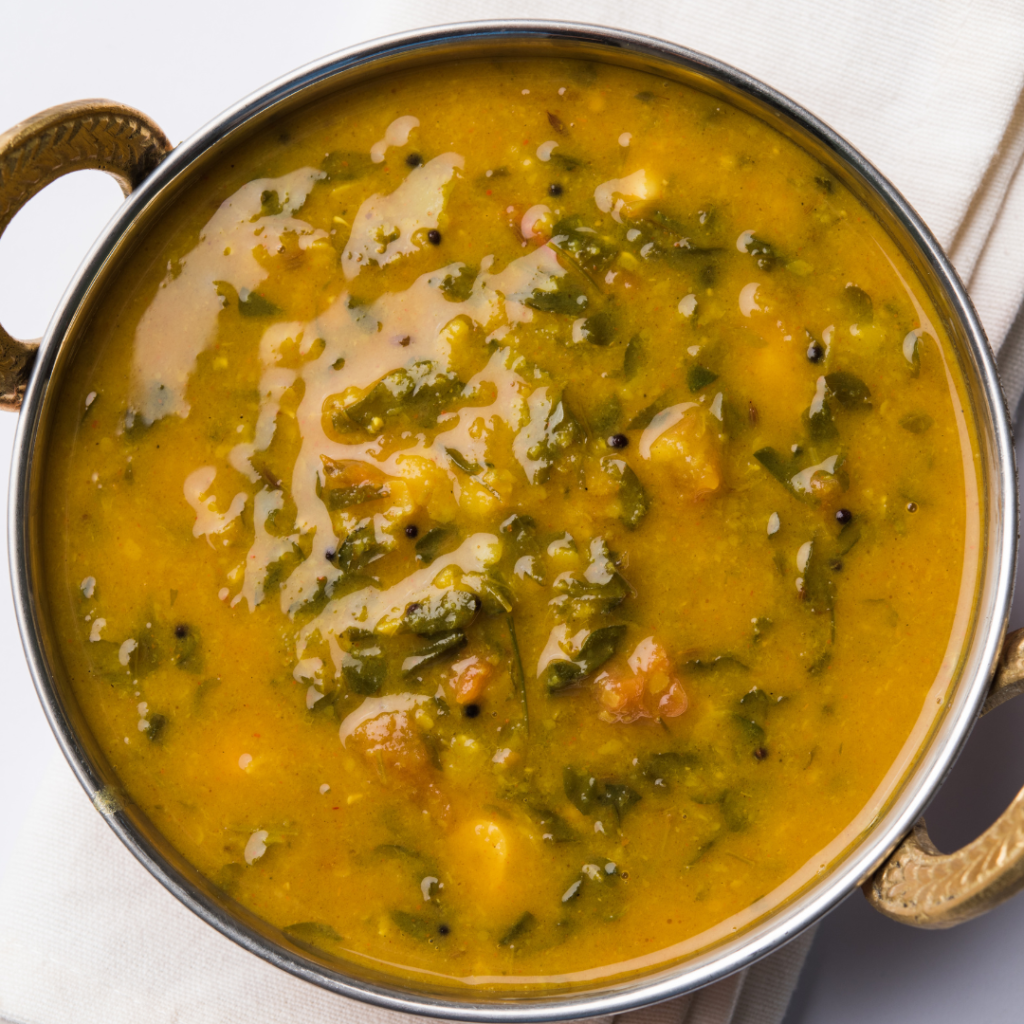 A healthy and flavorful dish made with lentils (usually yellow or red) cooked with spinach, tempered with garlic, cumin seeds, and spices, resulting in a nutritious and vibrant lentil preparation.