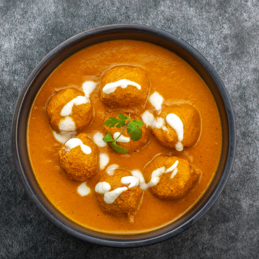 Soft and creamy paneer (Indian cottage cheese) and potato dumplings served in a velvety tomato and cashew-based gravy. The koftas are typically made with a stuffing of dry fruits and served with naan or pulao.