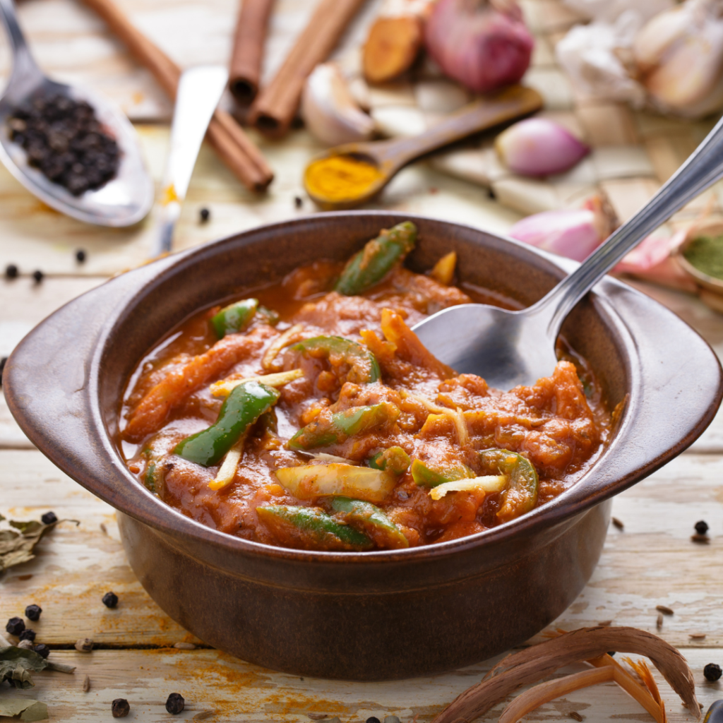 A colorful and spicy dish made with mixed vegetables stir-fried with aromatic spices and a tangy tomato-based sauce.