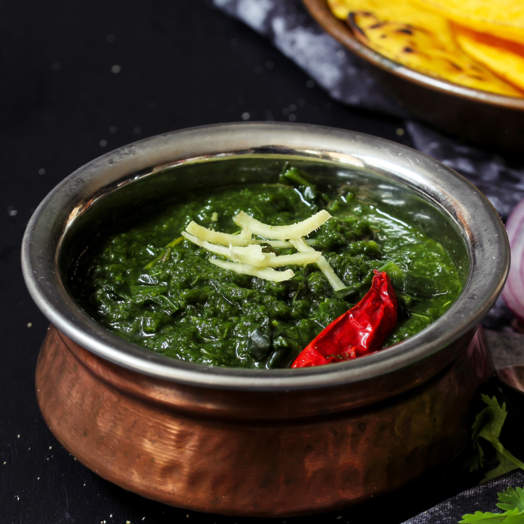A traditional Punjabi dish made with mustard greens (sarson) and other greens like spinach, cooked and tempered with ginger, garlic, and spices, resulting in a highly flavorful and nutritious green vegetable sabzi.
