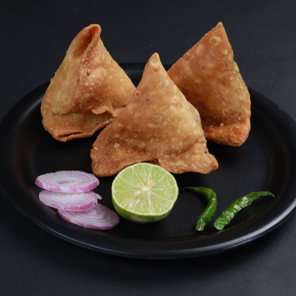 Crispy pastry filled with spiced potato and pea stuffing, deep-fried until golden brown.