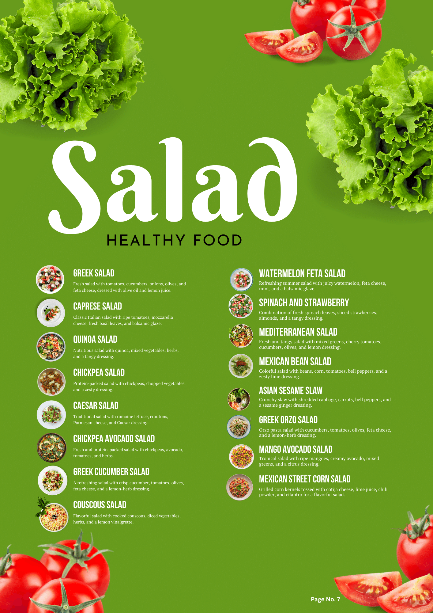 A refreshing salad made with fresh spinach leaves, paneer (Indian cottage cheese), cherry tomatoes, and a light dressing. It offers a good balance of protein and leafy greens.